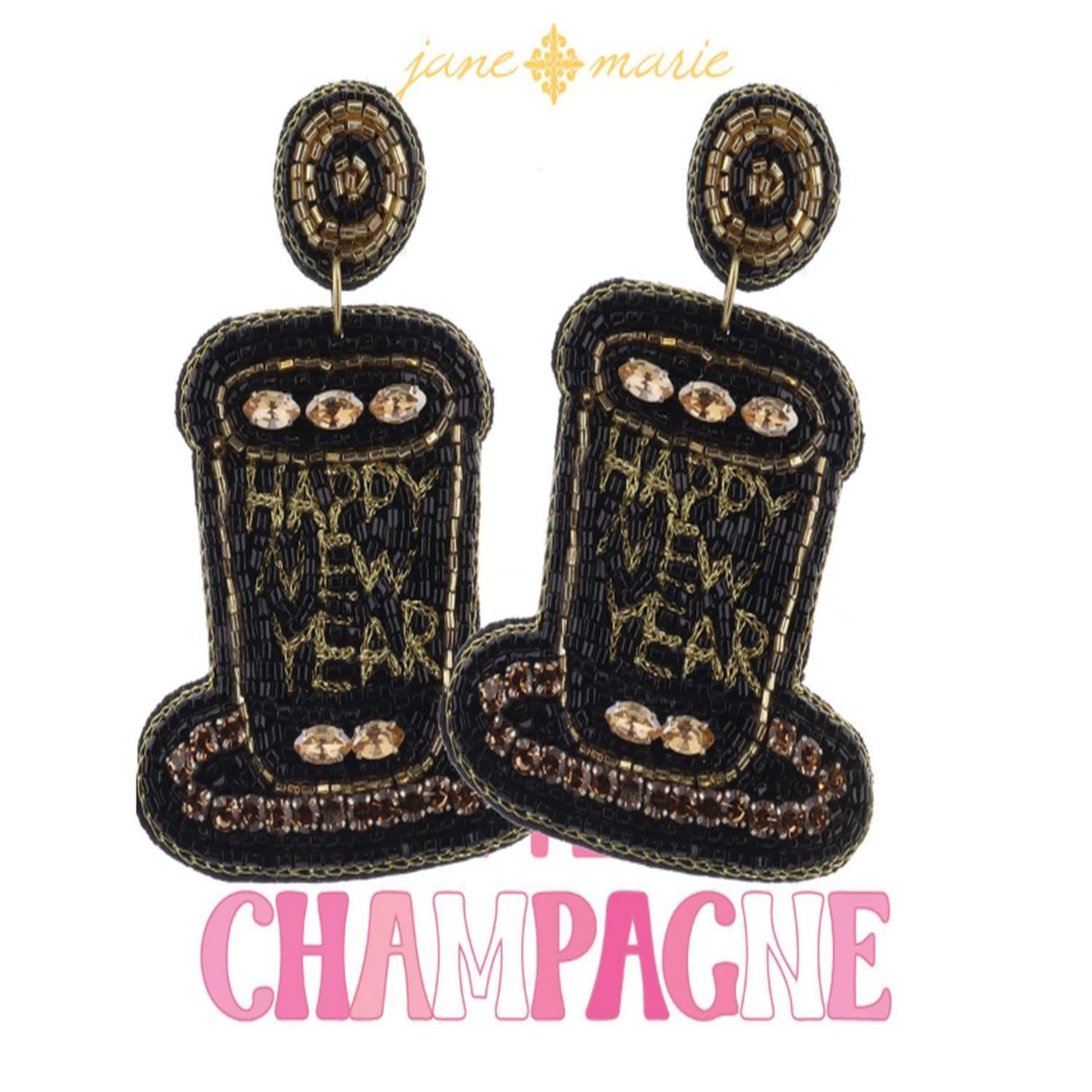Pendientes de sombrero "FELIZ AÑO NUEVO" con cuentas negras y doradas