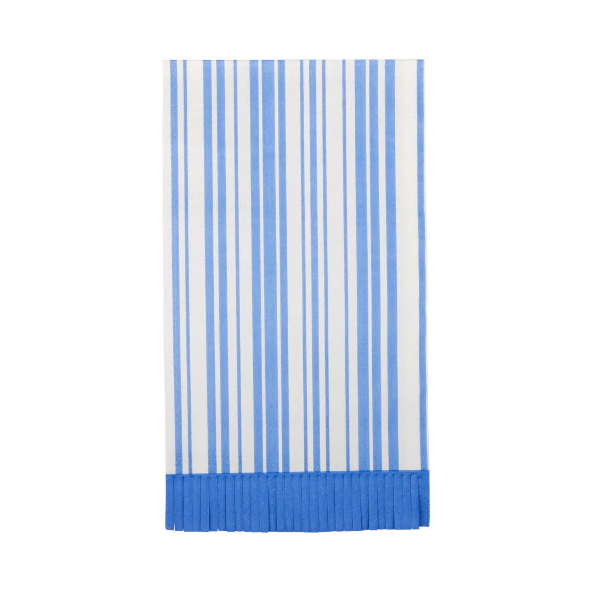 Bring some spring vibes to your next gathering with this Blue Stripe Fringe Guest Napkin. The playful blue stripe design and fun fringe edges will add a touch of whimsy to your table setting. Made from paper, these napkins are perfect for any occasion.