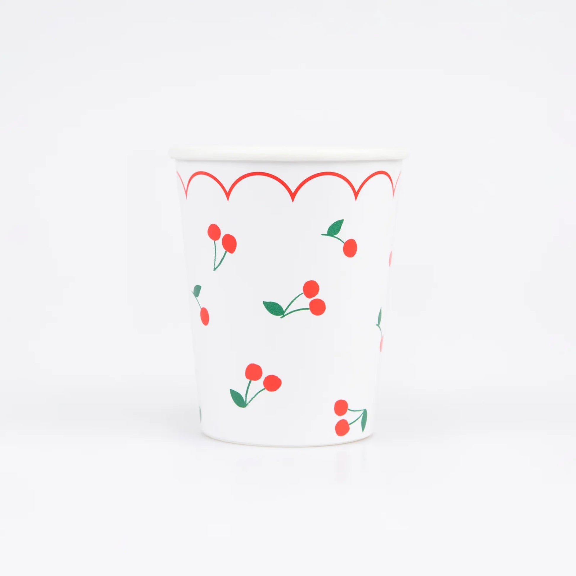 Summery and fun...cherries are the must-have design to give a fresh look to your parties. These pretty patterned paper cups, with red scalloped detail, will give a stylish effect to any drinks you serve. They are ideal for garden parties, picnics or whenever you want a vibrant touch.
