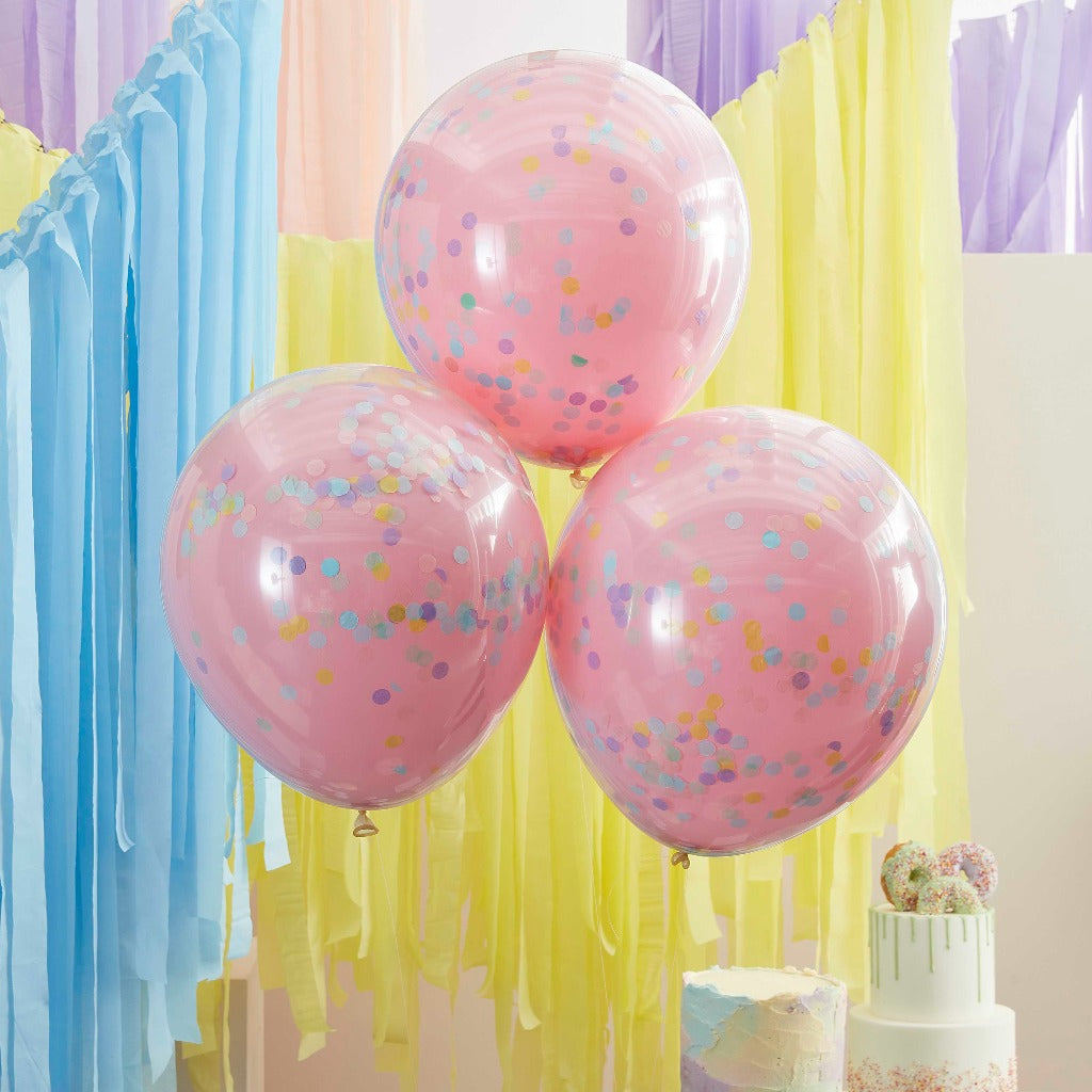 ¡Completa tu fiesta de colores pastel con estos globos de confeti! Incluye 3 juegos de globos de látex de doble capa.