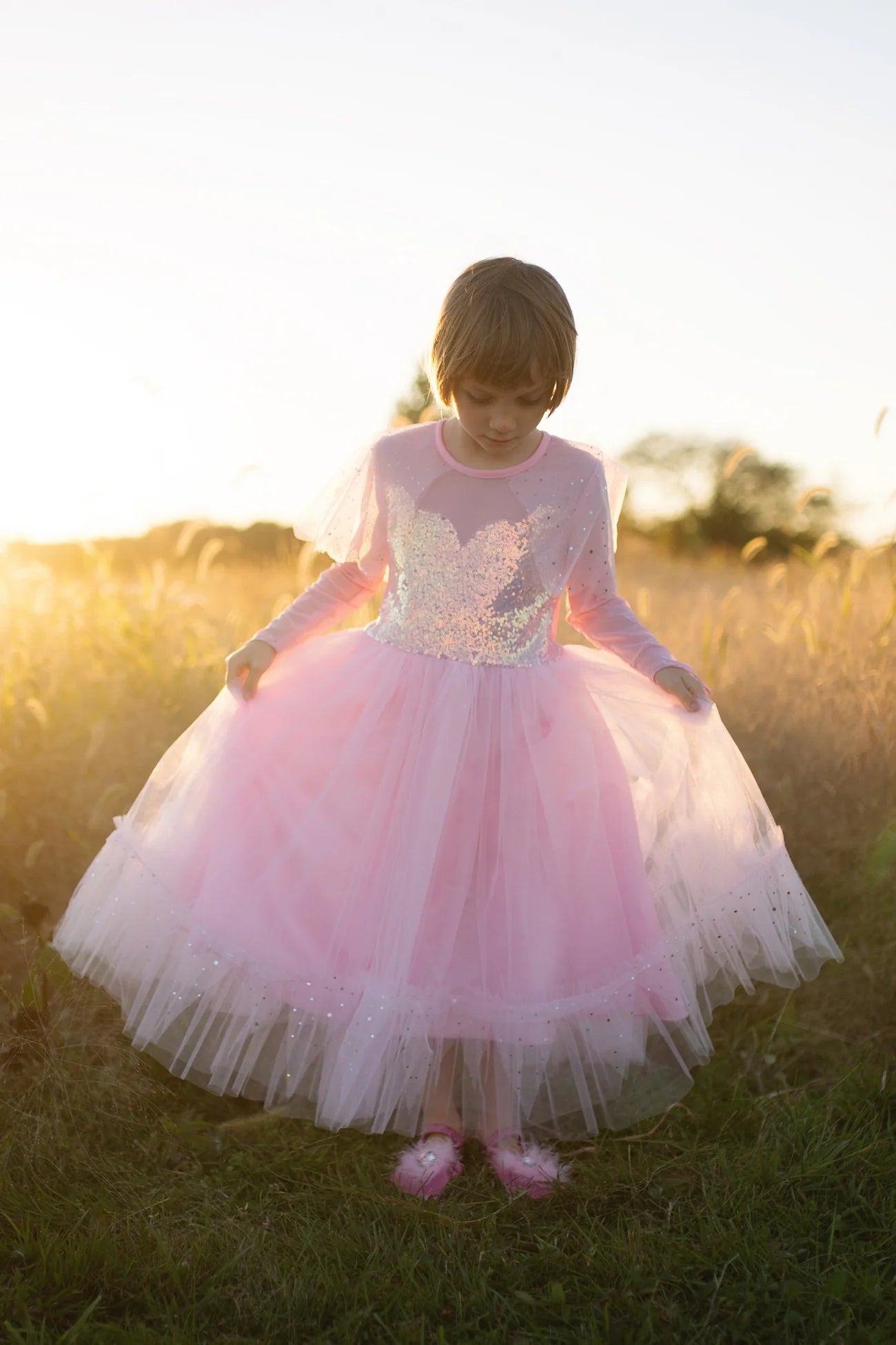 Elegant in Pink Princess Dress is a stunning design with a gorgeous sequinned bodice and illusion neckline (sweetheart neckline which is finished up to the neck with sheer and stretchy knit fabric) and satin trim. Attached to the neckline is a lovely sparkly capelet with scalloped finish, it’s made with pink mesh fabric showcasing printed holographic sequins. Elegant long sleeves are finished to a point. The skirt has a nice rich gathering of pink tulle finished with a ruffle made with the same holographic print as the capelet