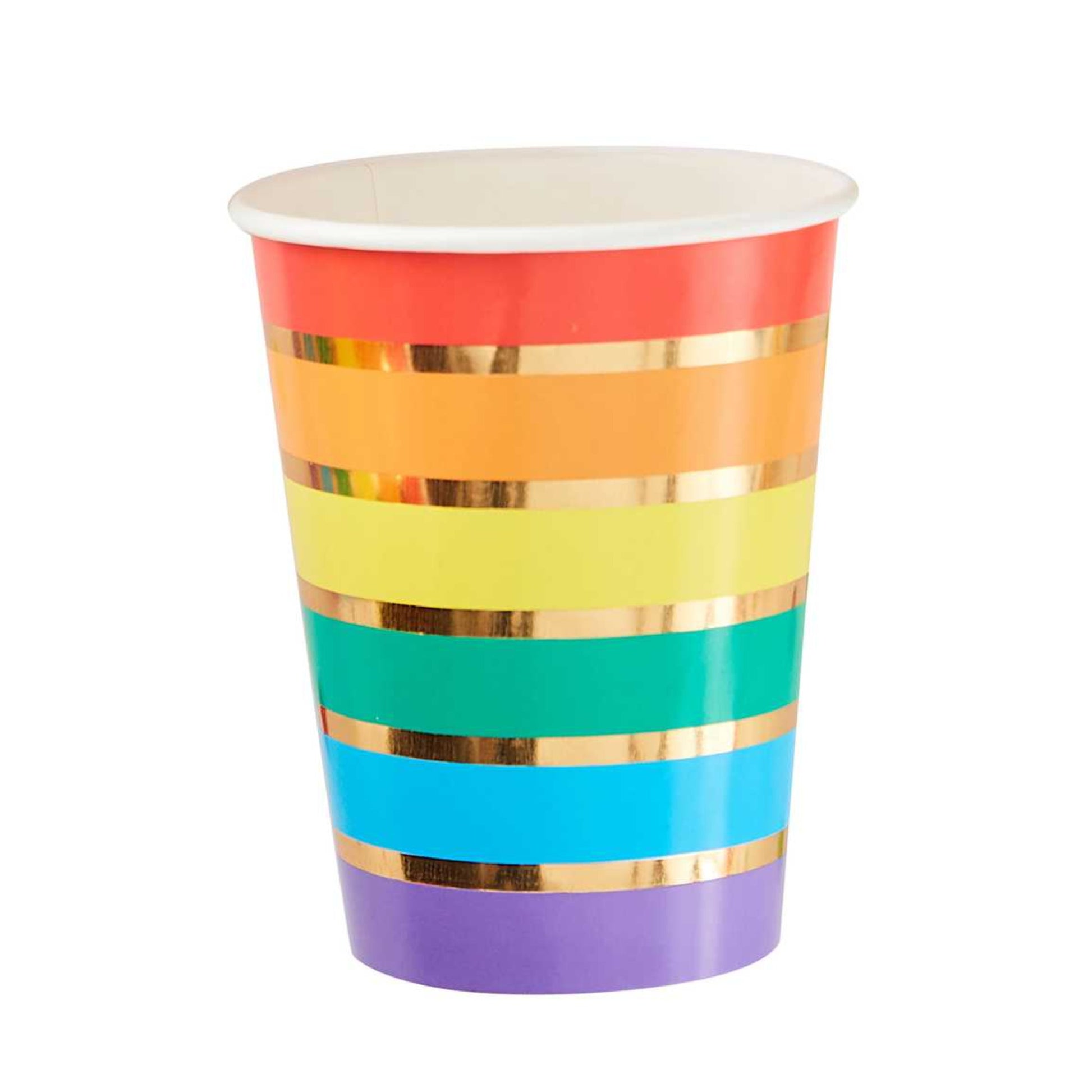 Bring your party to life with these bright and colourful multi-coloured rainbow paper cups. Each pack includes 8 rainbow party paper cups. Each cup holds 9 oz and measures: 7.5cm (W) x 9cm (H).