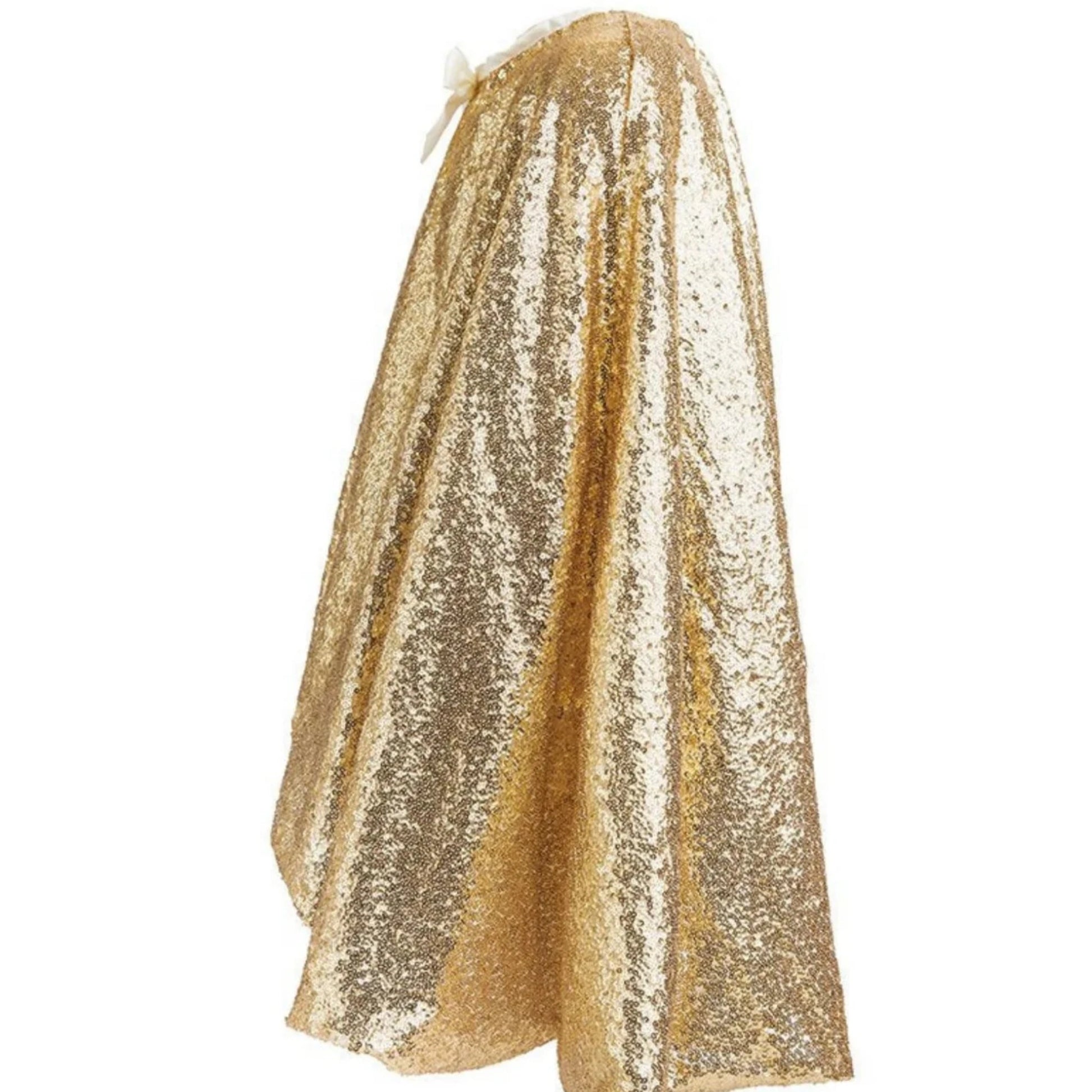 Shine and Sparkle with this gold sequin sparkle cape. The sequins on this cape will shine bright with elegant gold sequins. The collar is softly lined and complete with a lovely cream bow. This cape is perfect for the holiday season!