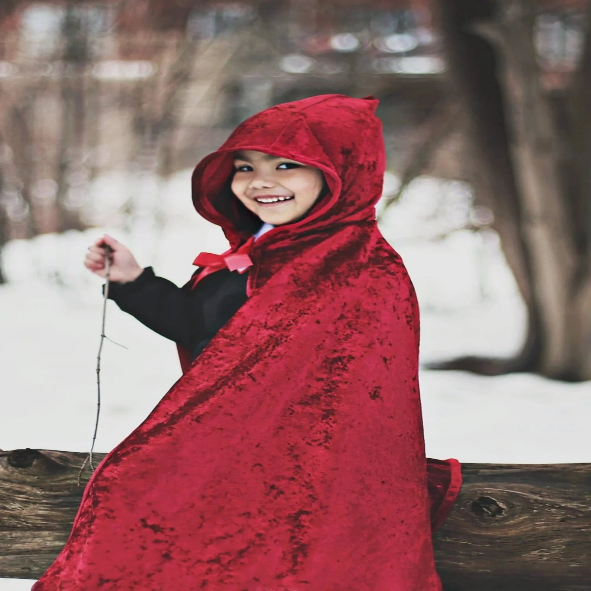 Made from a luxurious and heavy crushed velour, this is the most luxurious little red cape made. Proudly made in Canada, this cape features a large hood with a Velcro closure and a red satin ribbon detail. This perfect Little Red Riding Hood cape is of course machine washable for multiple adventures.