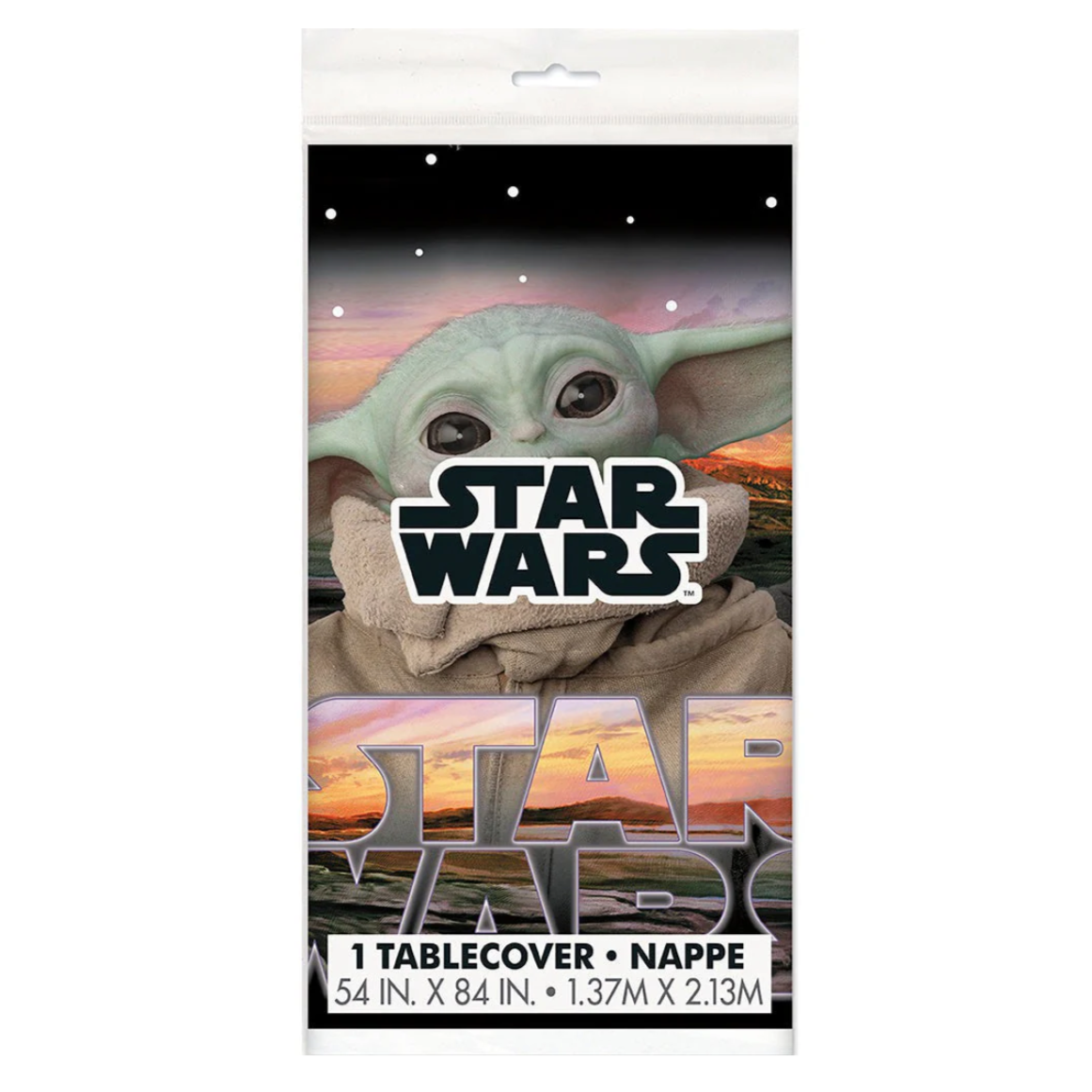 Deck out your party table with a Star Wars The Mandalorian themed table cover. A great way to protect your table from spills and decorate at the same time. Table cover is 54"x 84" and features The Child (Baby Yoda), The Mandalorian, and IG-11.