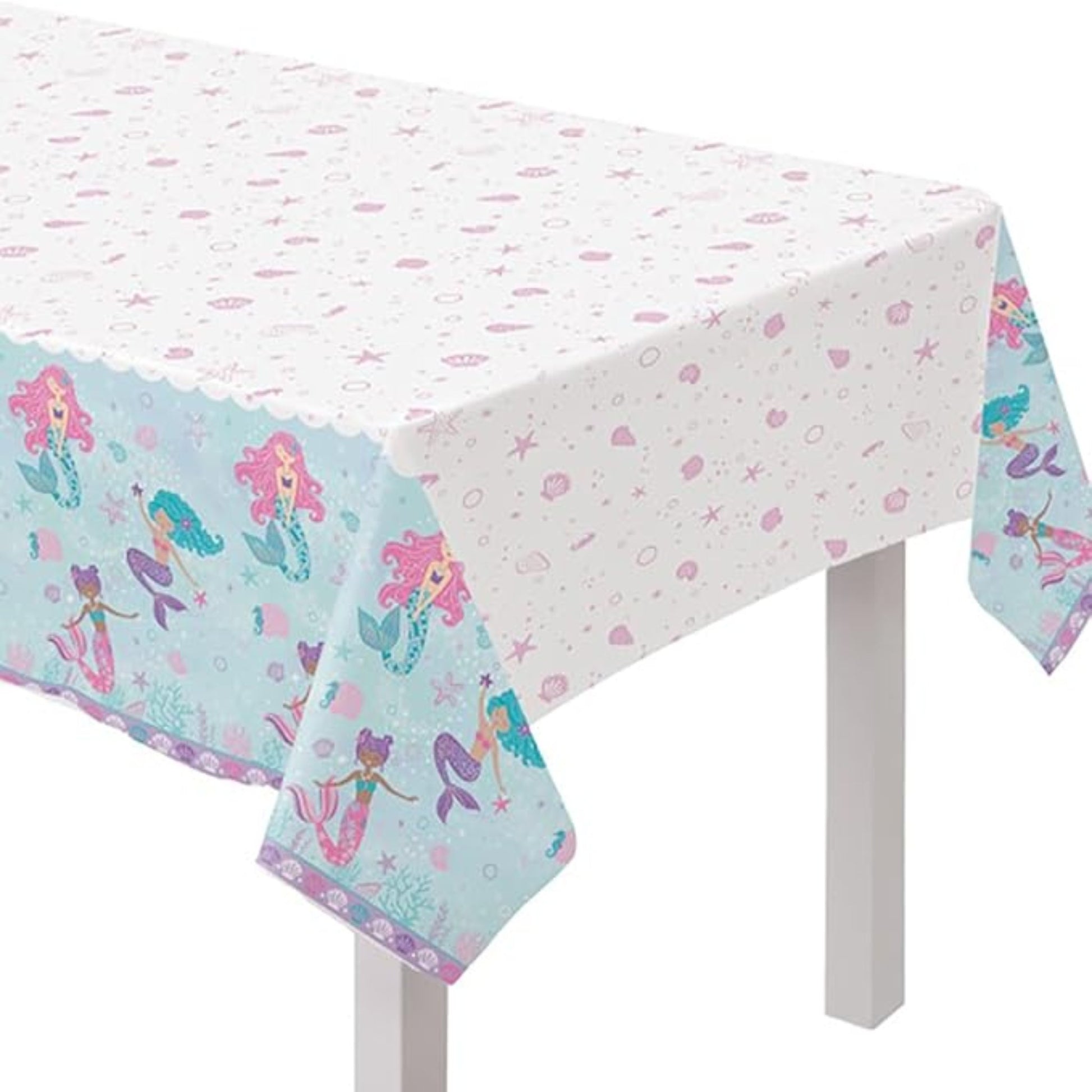 Diseño divertido: este mantel cuenta con bonitas sirenas impresas en el lateral y conchas marinas rosas y estrellas de mar en la parte superior del mantel en fondo blanco.