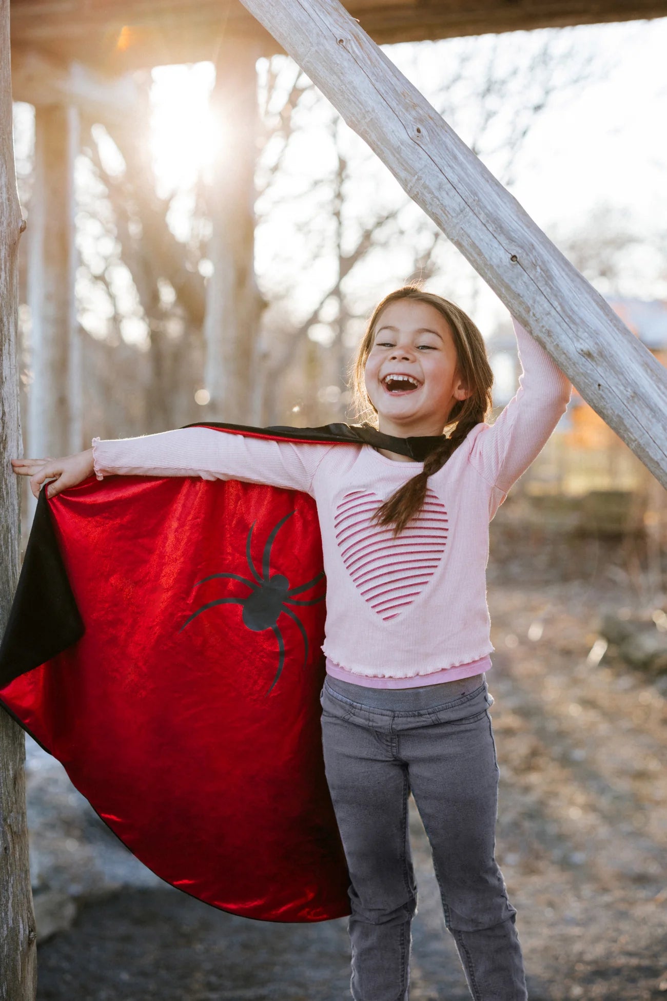 Introducing the Kids Reversible Spider Bat Cape, a captivating cape proudly made in Canada! On one side, your little hero can don the iconic spider emblem, inspiring a sense of agility, cunning, and spider-like abilities. Flip it over, and they'll unveil the mesmerizing bat symbol, ready to soar through the skies with unparalleled strength and nocturnal prowess. The vibrant colors and intricate stitching bring these legendary characters to life, making every adventure more thrilling.