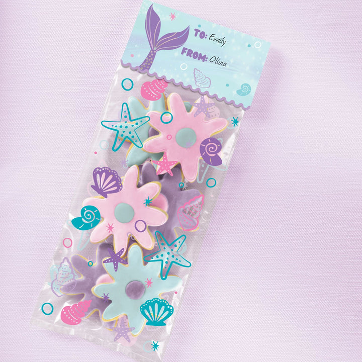 Our Shimmering Mermaids Treat Bag Kit is perfect for your little mermaid fan. The kit includes 20 headers and cello bags, measuring 2 5/8" x 5" and 11 1/8" x 5" respectively. Treats not included, allowing you to customize your mermaid-themed gifts. Give your guests something special they won't forget.