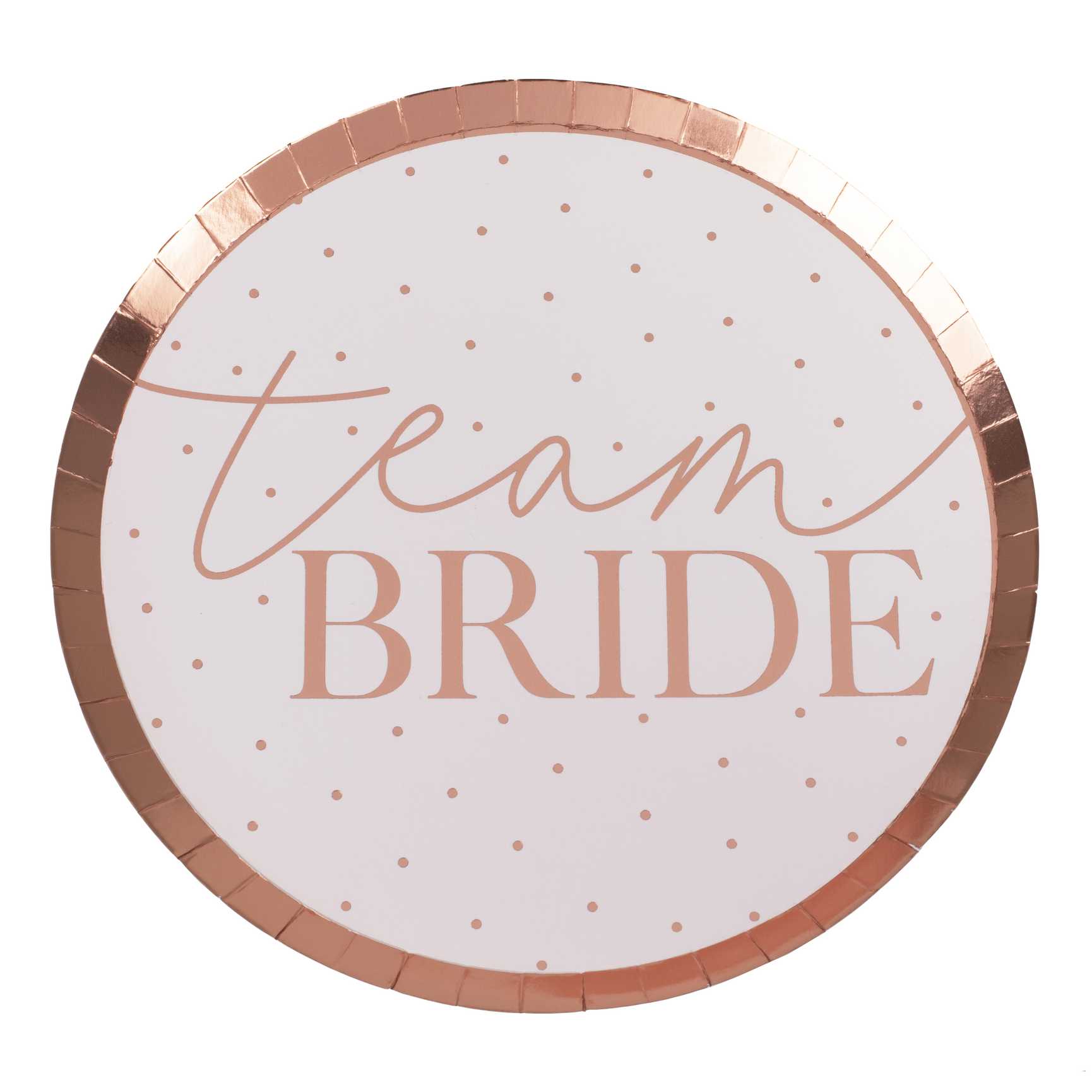 El diseño laminado Team Bride en oro rosa luce hermoso sobre el bonito fondo rosa ruborizado. ¡Asegúrate de agregar nuestras servilletas Team Bride para evitar derrames en esos conjuntos listos para la fiesta!