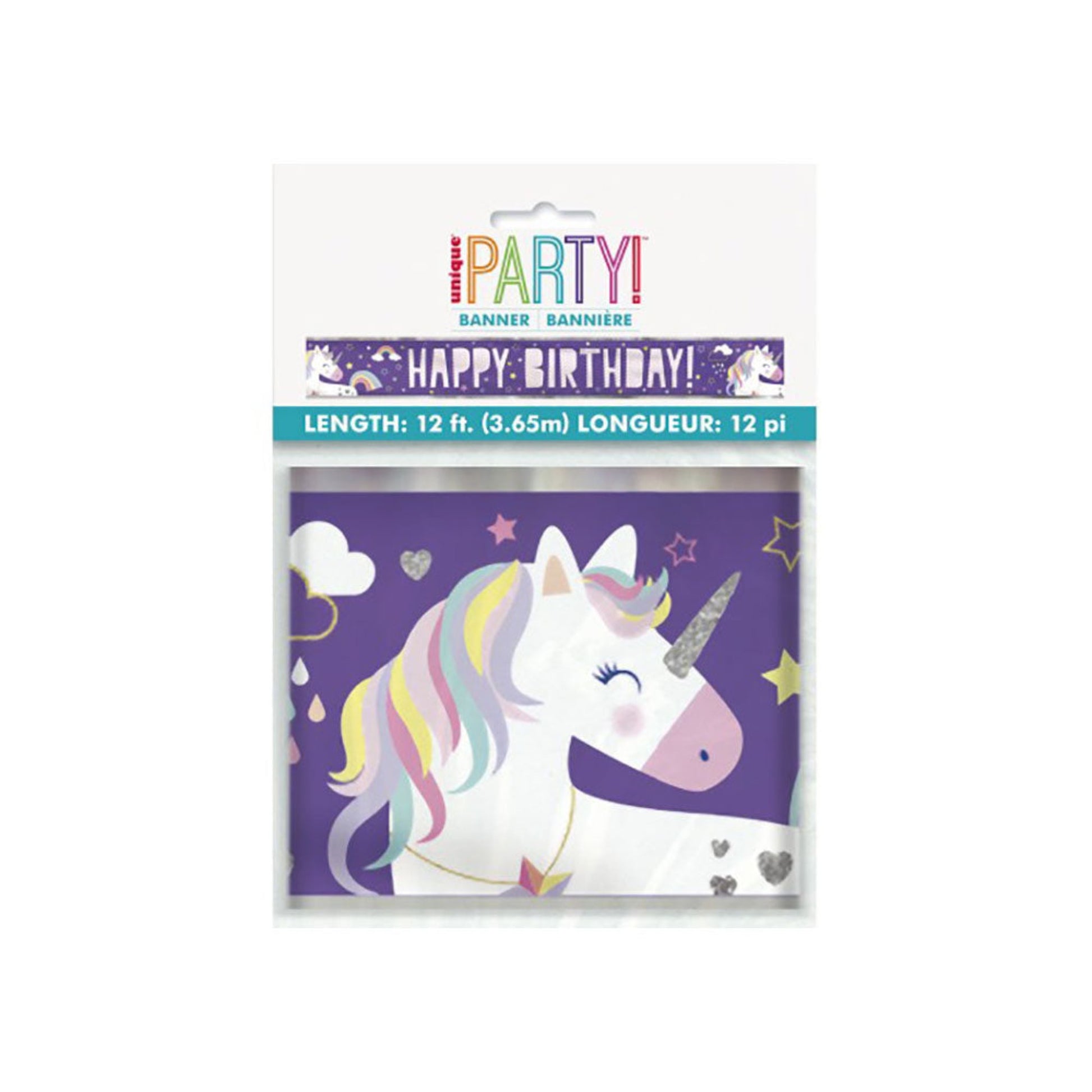 Banner de aluminio con temática de unicornio. Dice feliz cumpleaños. Esto se puede utilizar como un cartel de 9 pies de largo o cortarlo en 3 carteles más pequeños. Para coordinar decoraciones de cumpleaños Glitz visite nuestra tienda
