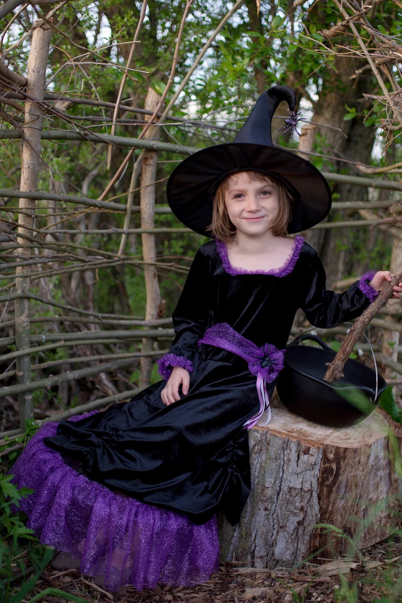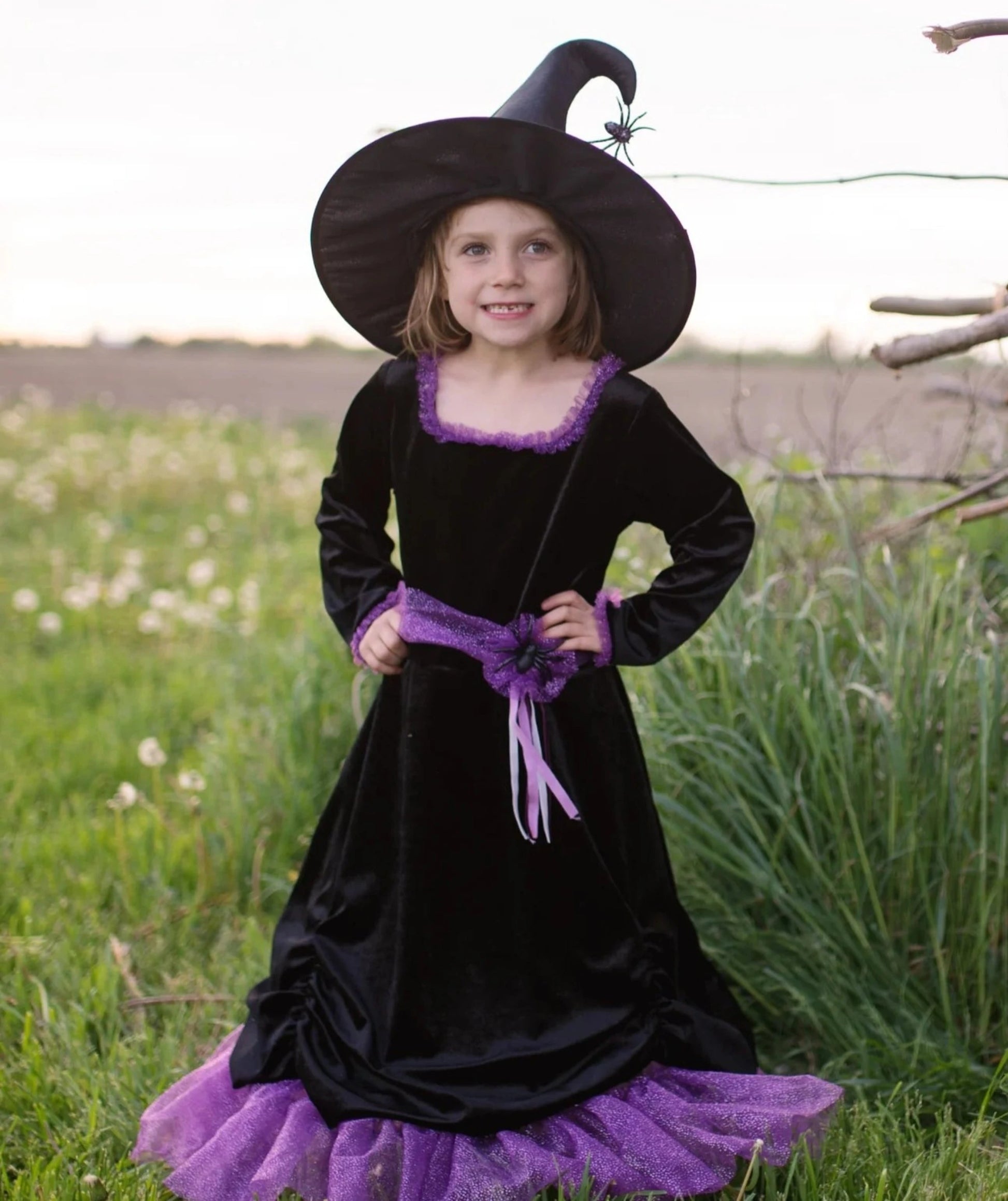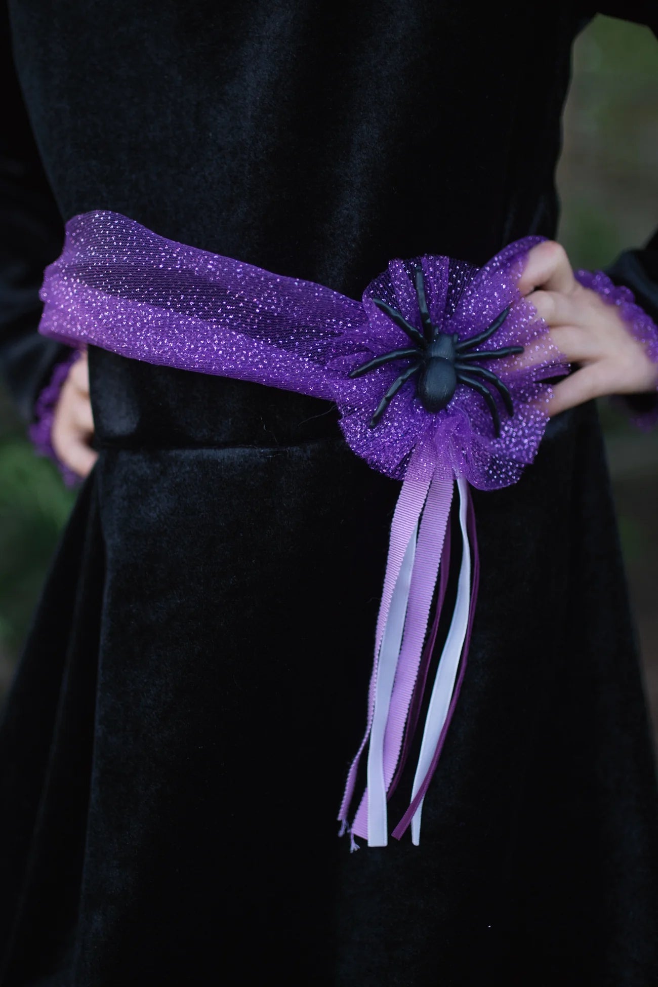 Vera the Velvet Witch Dress & Hat is all about the velvet! This dress is made with gorgeous soft black velvet and trimmed with purple accents. Beautiful violet glitter tulle embellishes the waist, neckline, sleeves, and the ruffle on the bottom. This dress includes a hoop for fullness and the black velvet skirt drapes over the hoop. There is a black glitter spider on the waist at the hip, and also a black glitter spider dangles from the crook of the hat! Elegant, stylish, and absolutely adorable!