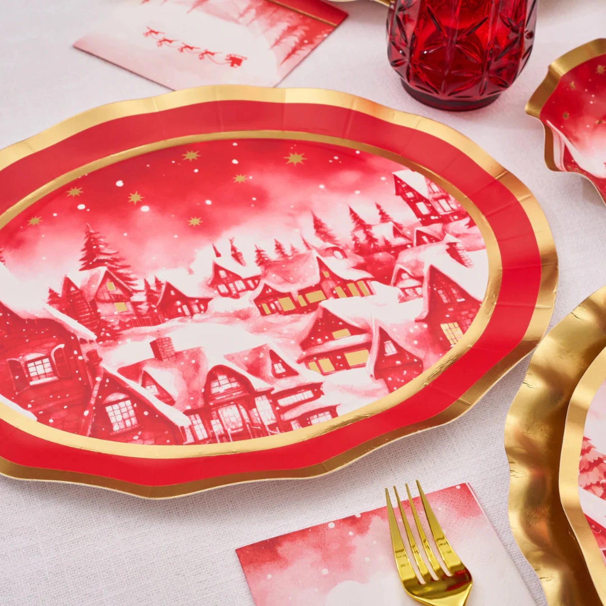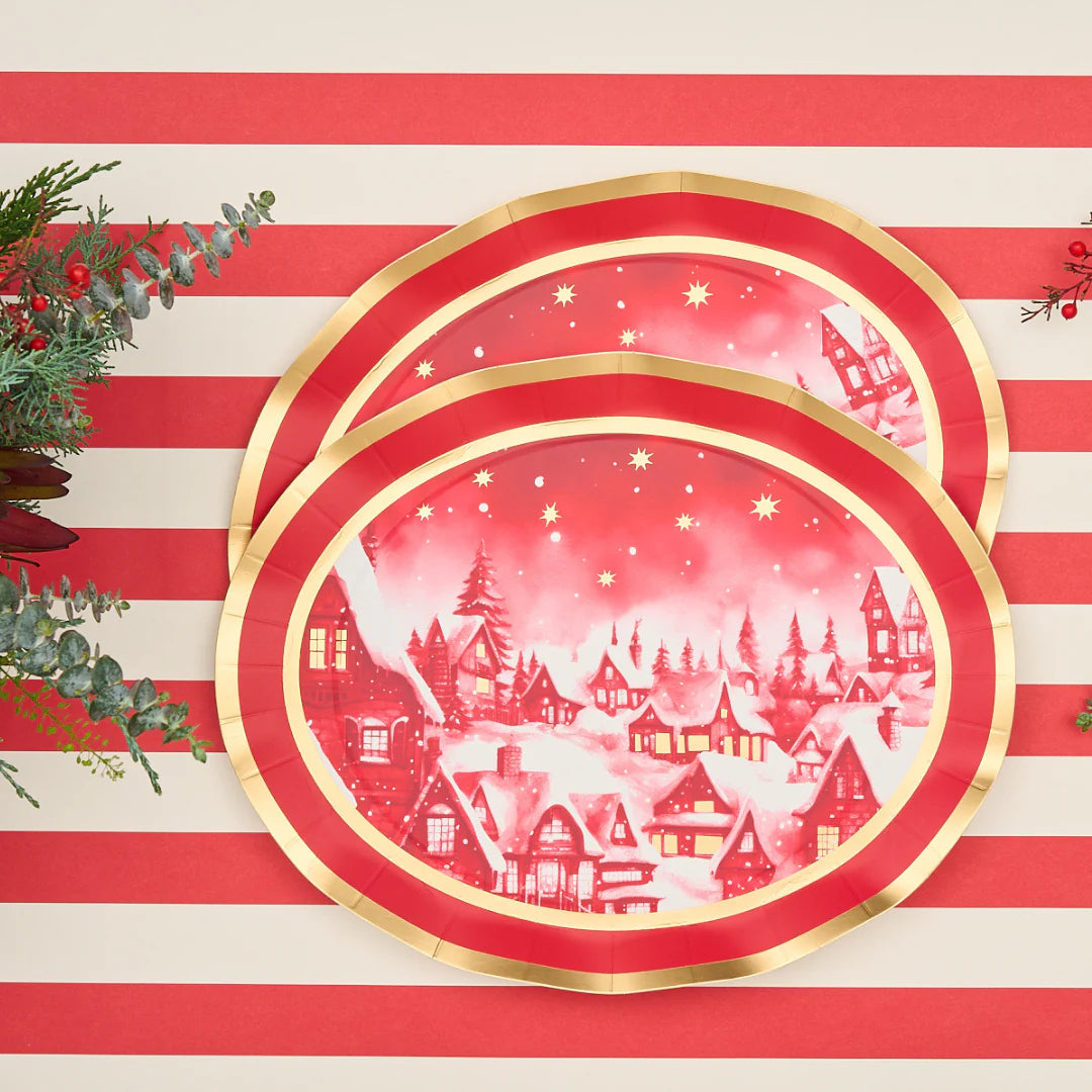 Add a touch of festive elegance to your table this holiday season with our new Christmas Village Table Setting. Featuring a picturesque snowy village scene adorned with shimmering gold foil stars, these platter plates seamlessly blend modern style with timeless elegance, perfect for the Christmas season. The beautiful red hue coupled with our signature scalloped gold edge plates, creates a festive and sophisticated look that will enhance any table setting. Your guests won't believe that they're disposable!