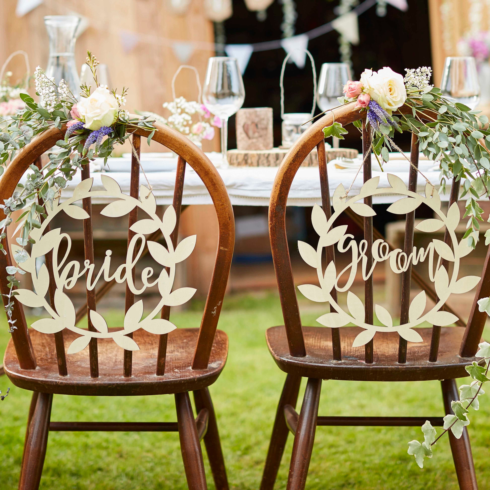 Con detalles de enredaderas, estos carteles de madera para sillas de novios son perfectos para cualquier tema.