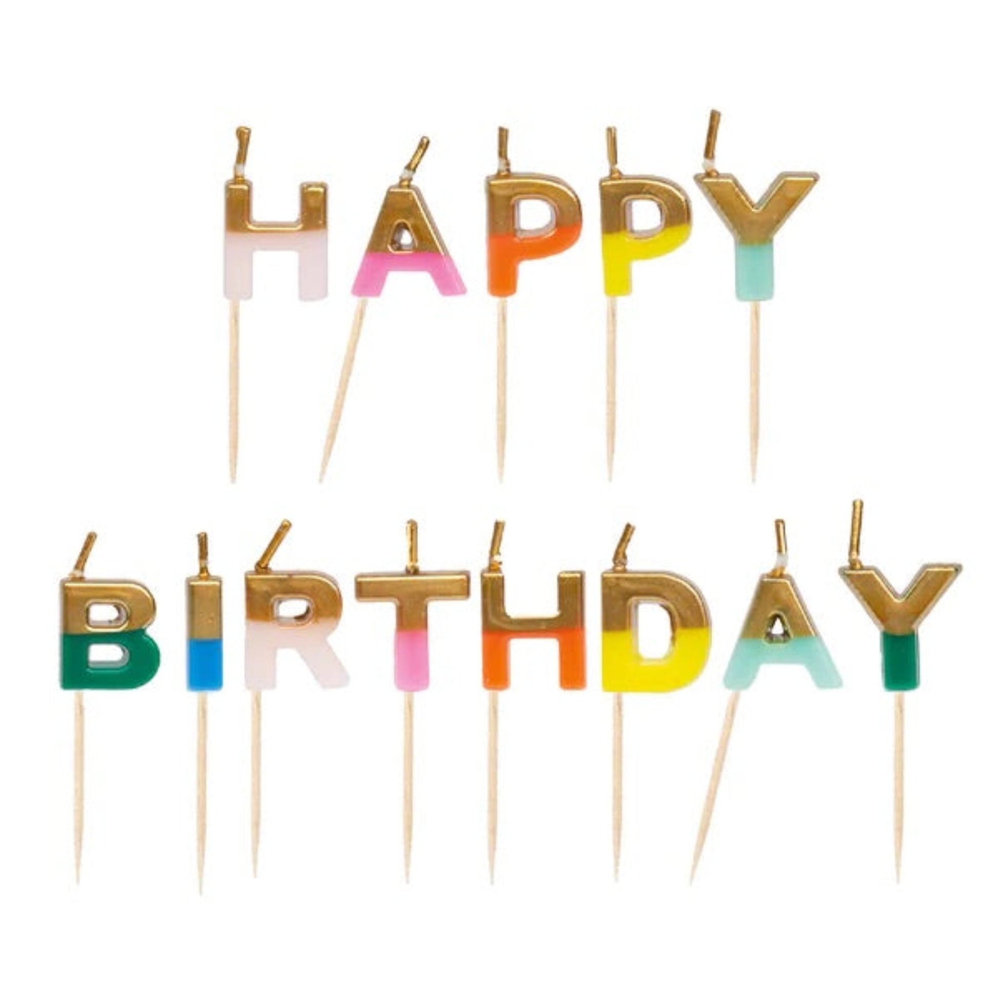 - Includes 13 multicolor letter candles spelling "Happy Birthday"