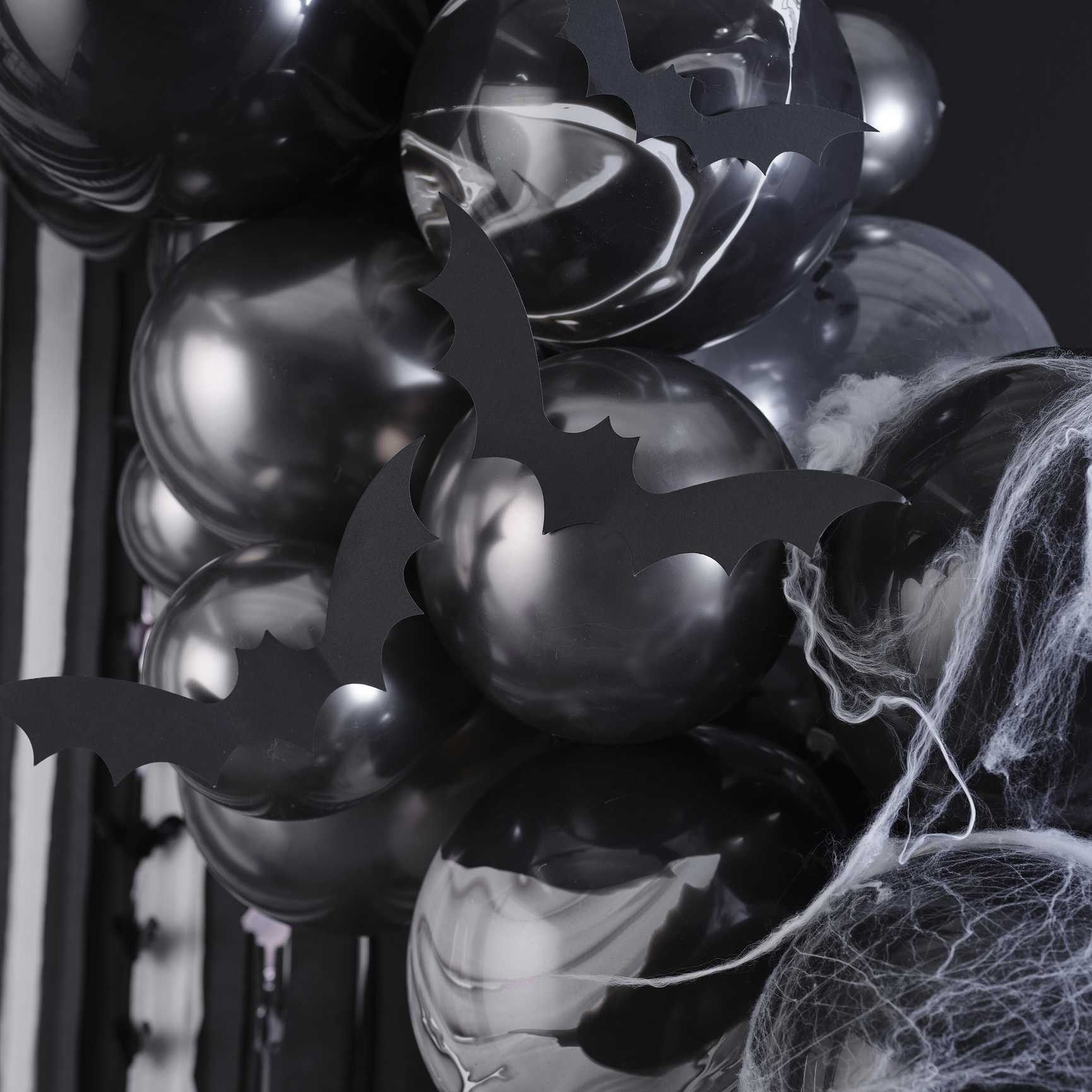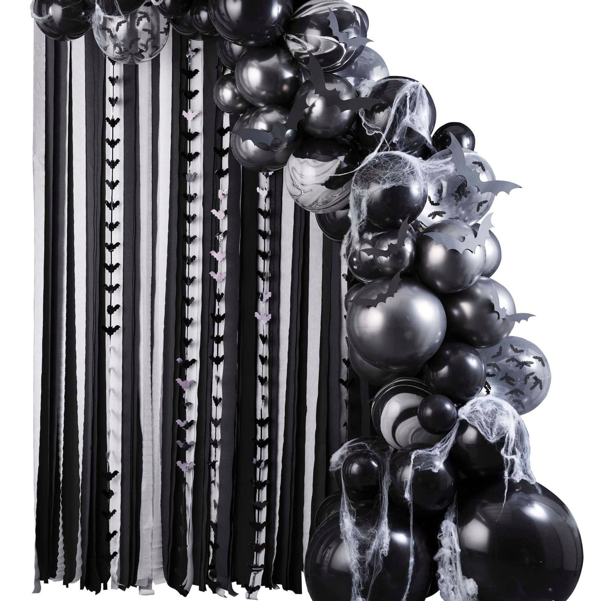This balloon arch kit contains the accessories needed to create a spooky entrance to your Halloween Party, including 75 black, gunmetal chrome, marbled and black confetti balloons in various sizes, with 110m of black and white crepe paper streamers, hanging bat strands, white webbing and card bats.