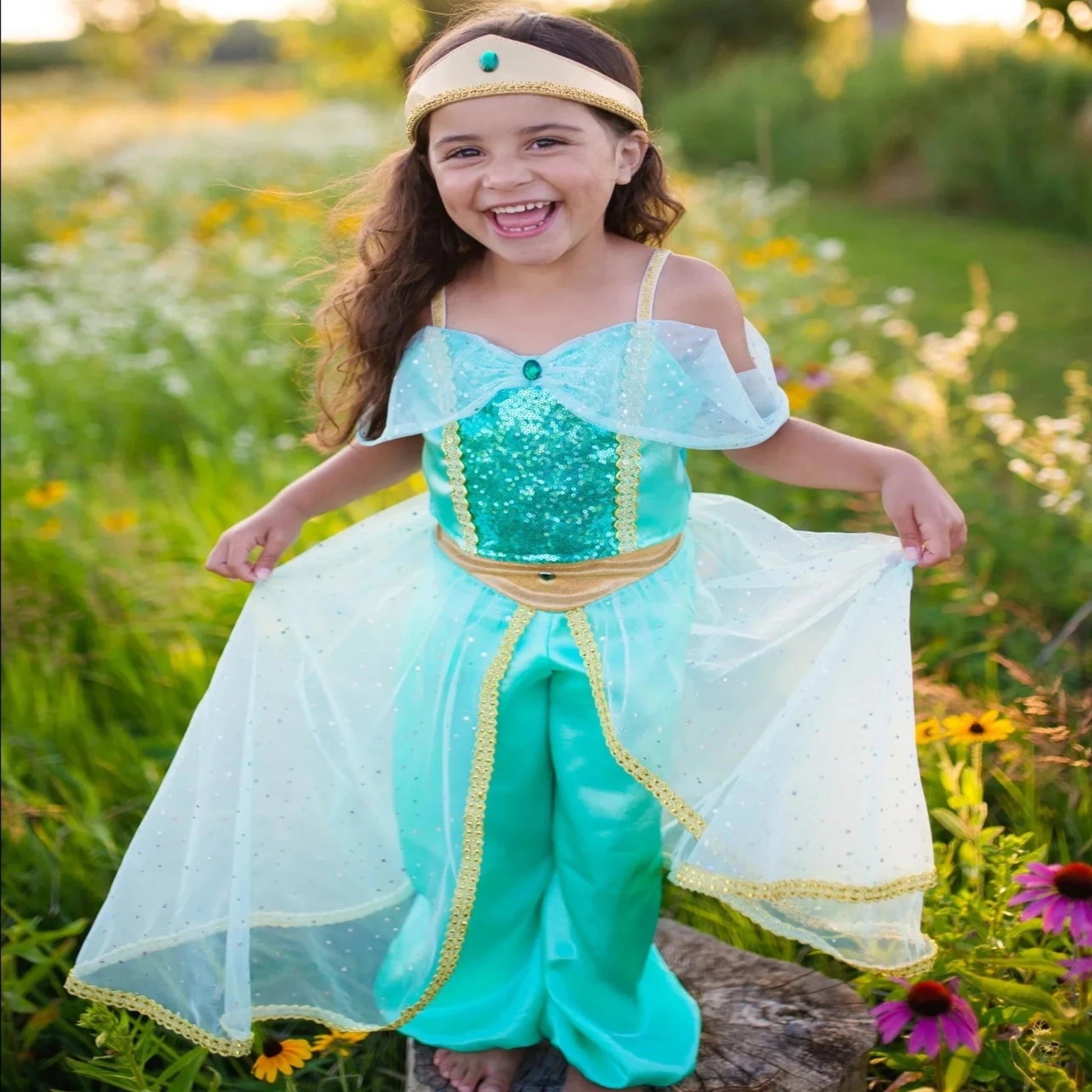 Jasmine's magical adventures begin with this gorgeous, premium quality 3-piece pant set in vibrant turquoise tones and contrasted with fancy golden trims. Satin pants have a gold liquid knit belt adorned with a shiny emerald gem, and a sequined tulle overlay trimmed with fancy metallic golden trims. The top features a satin bodice, emerald-colored sequined inset, gold elastic straps, and it's adorned with off the shoulders tulle collar with a green emerald gem. This set comes with a liquid knit gold headpiece accented with fancy gold trim and an emerald gemstone.