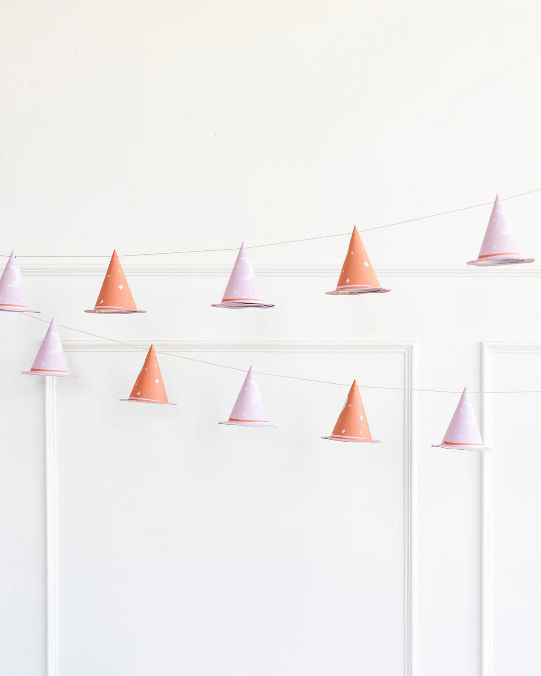 Upgrade your Halloween decor with this playful pink witch hat banner. Bring a touch of whimsy to your holiday celebrations with this unique and festive addition. Perfect for adding a pop of color and charm to any party or gathering.