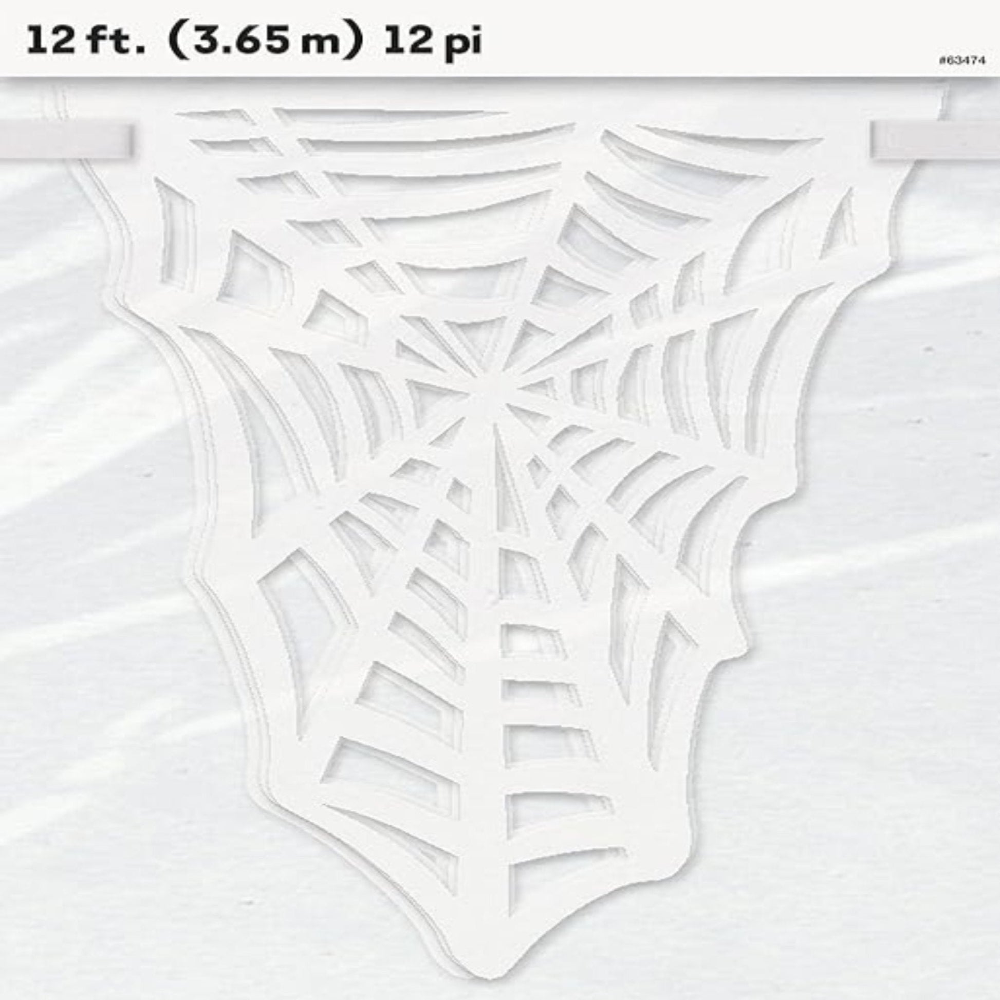 This flag banner features a cut out cobweb design, ideal for a Halloween party or fancy dress party