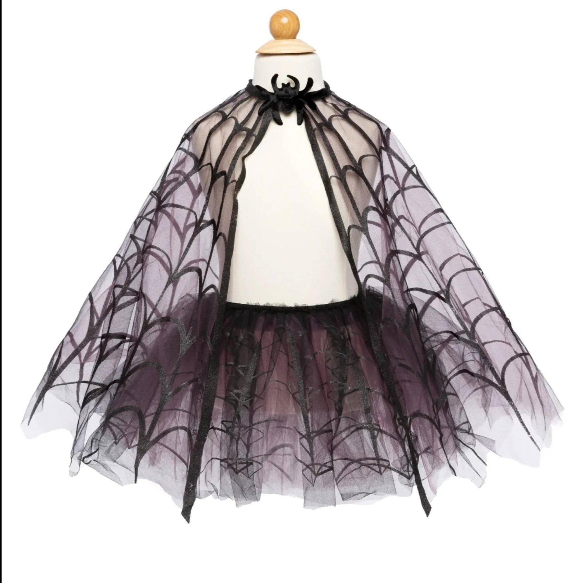 This enchanting ensemble features a black tutu skirt with layers of tulle and a spider web patterned overlay. The waistband is elastic, ensuring a comfortable fit for children of all sizes. The coordinating cape is made of mesh black fabric with spider web detailing and is held in place with a velcro fastener at the neck. Your child will love the spooky yet stylish design and the opportunity to become a witchy spider queen. Pair with our Mighty Witch Hat to complete the look!
