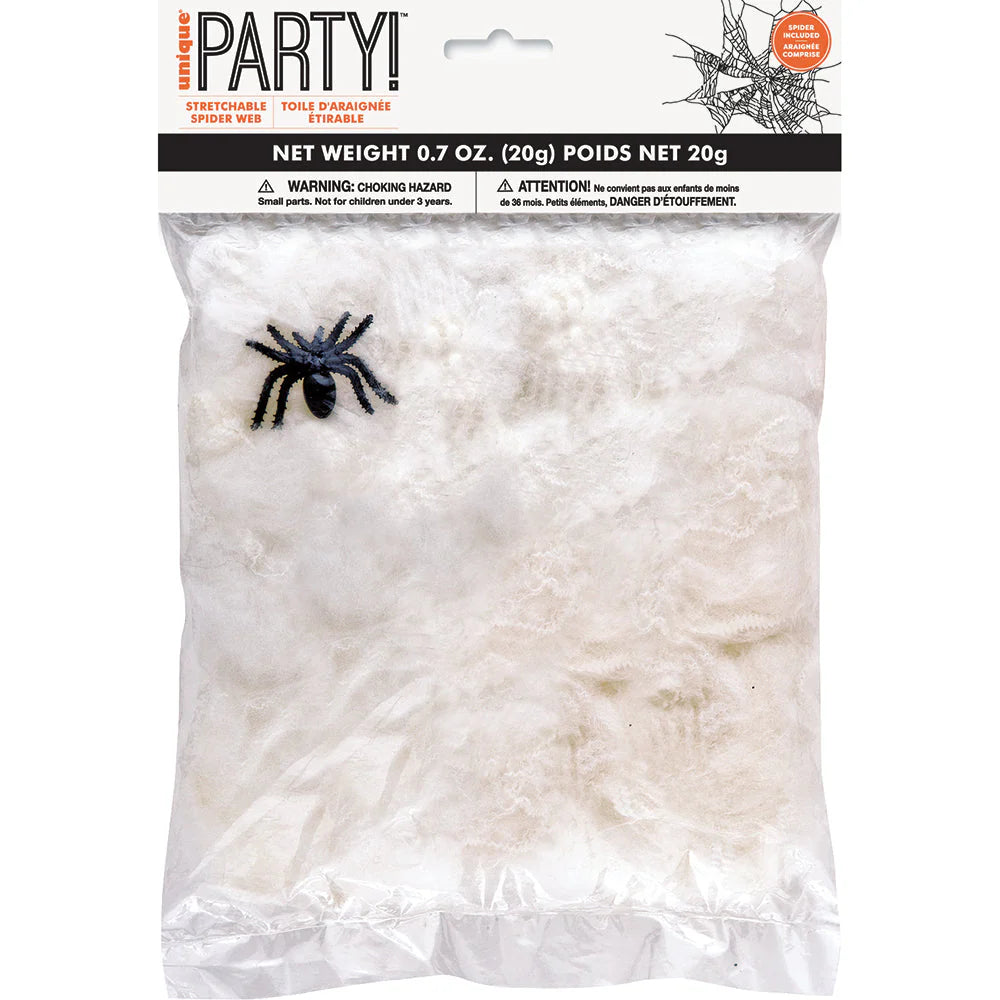 Add some extra fright to everyone's night by using this super stretchy realistic spider cobweb material. This silk-like spider webbing looks scary hung by itself or even better if you place your own extra spiders in it. Those that are affected by arachnophobia will have spine tingling fright when they come across these spooky spiders and their webbing. Cobwebs are the perfect finishing touch to any Halloween theme party, haunted house, graveyard, entryway, wall or ceiling. Includes 1 black plastic spider.